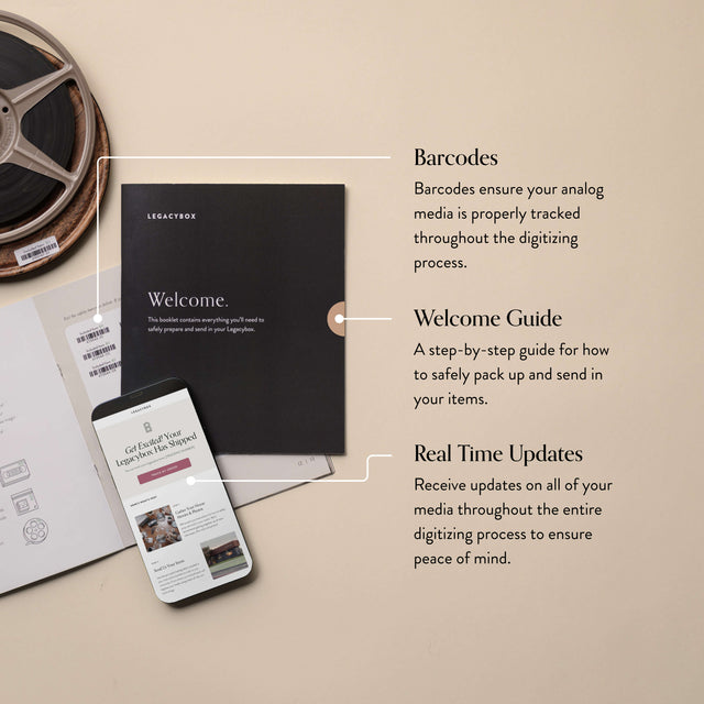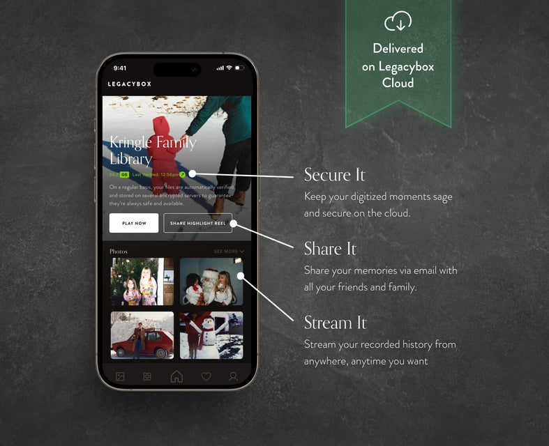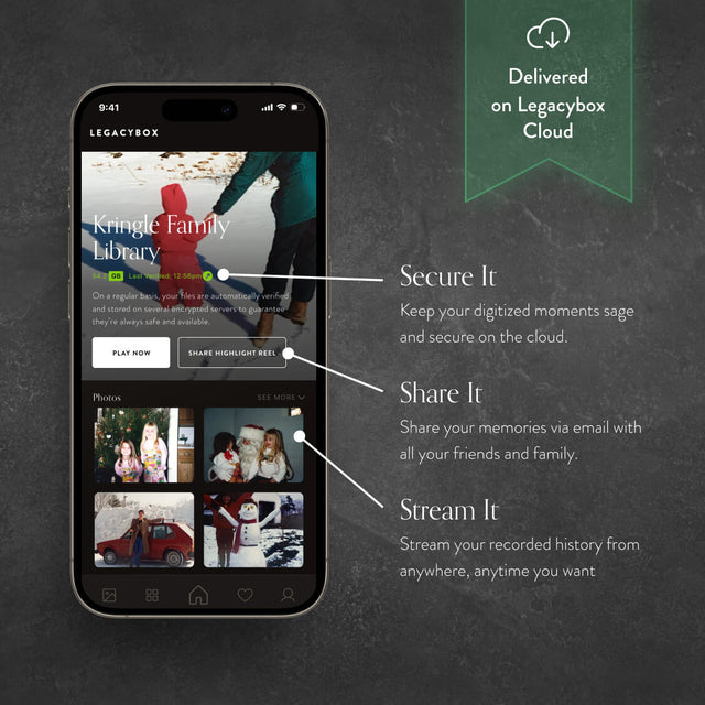You'll receive your original memories plus digitized, future-proof, ready to relive digital copies on Legacybox Cloud. Stream, share and download from anywhere.