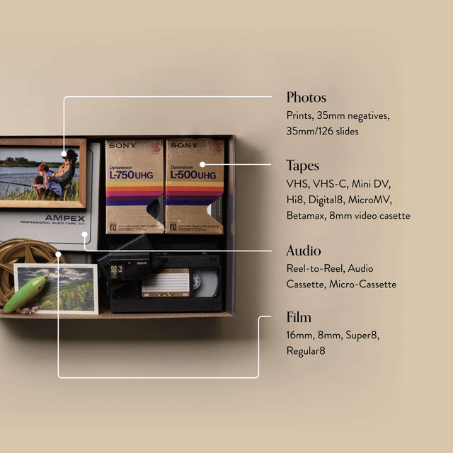 We send you a box to fill with your home movies, VHS tapes, photos, and film.
